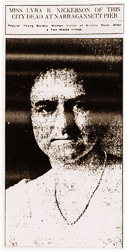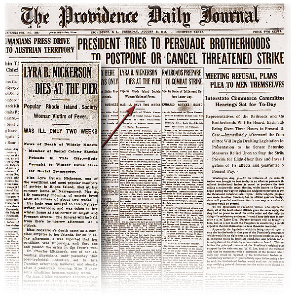 Lyra Brown Nickerson's death notice. The front page of "The Providence Daily Journal" August 31, 1916.
