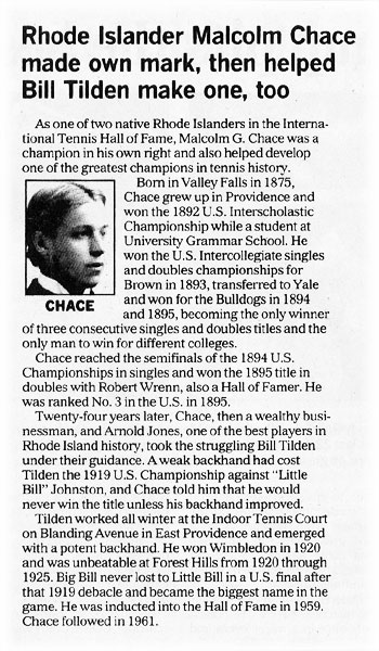 A Providence Journal article about Malcolm Chace in celebration of the 50th Anniversary of the Tennis Hall of Fame, published in July of 2004.